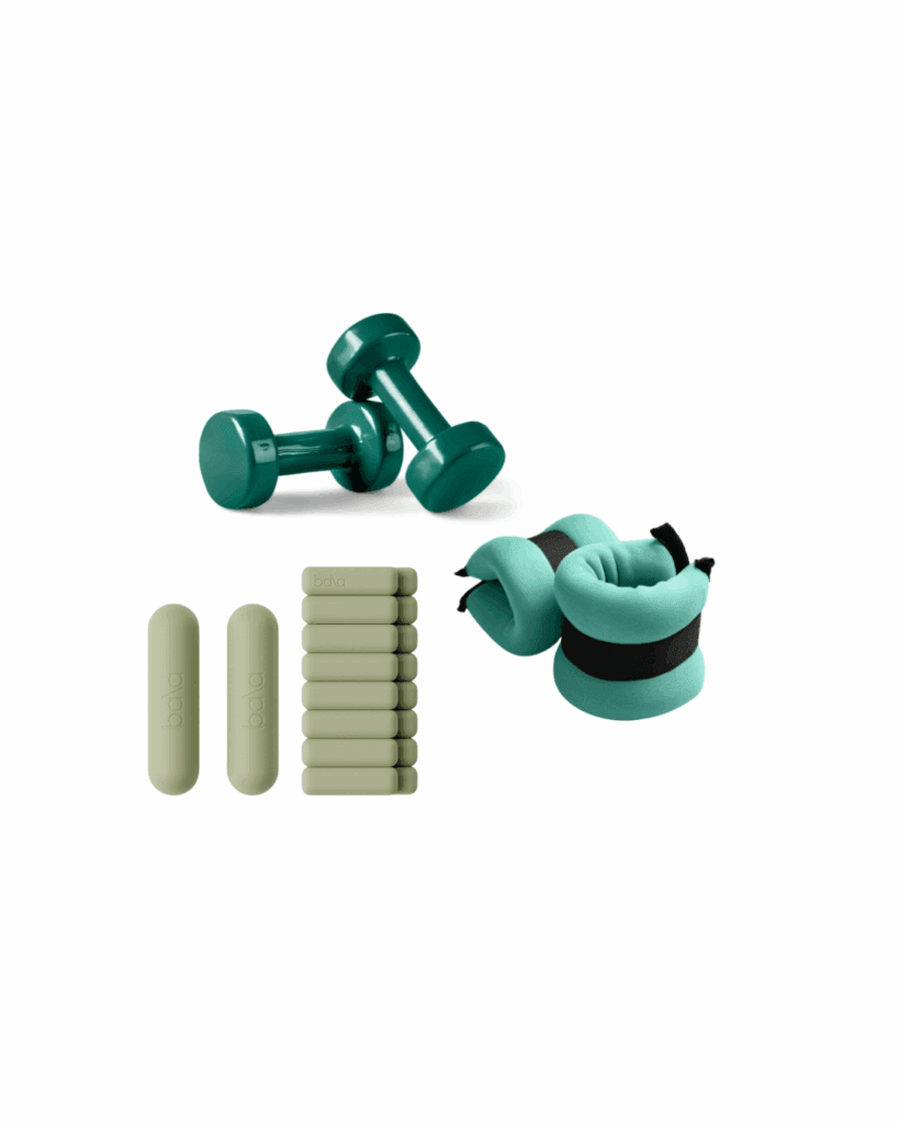 Mancuernas ligeras y semi pesadas, muñequeras y/o tobilleras.